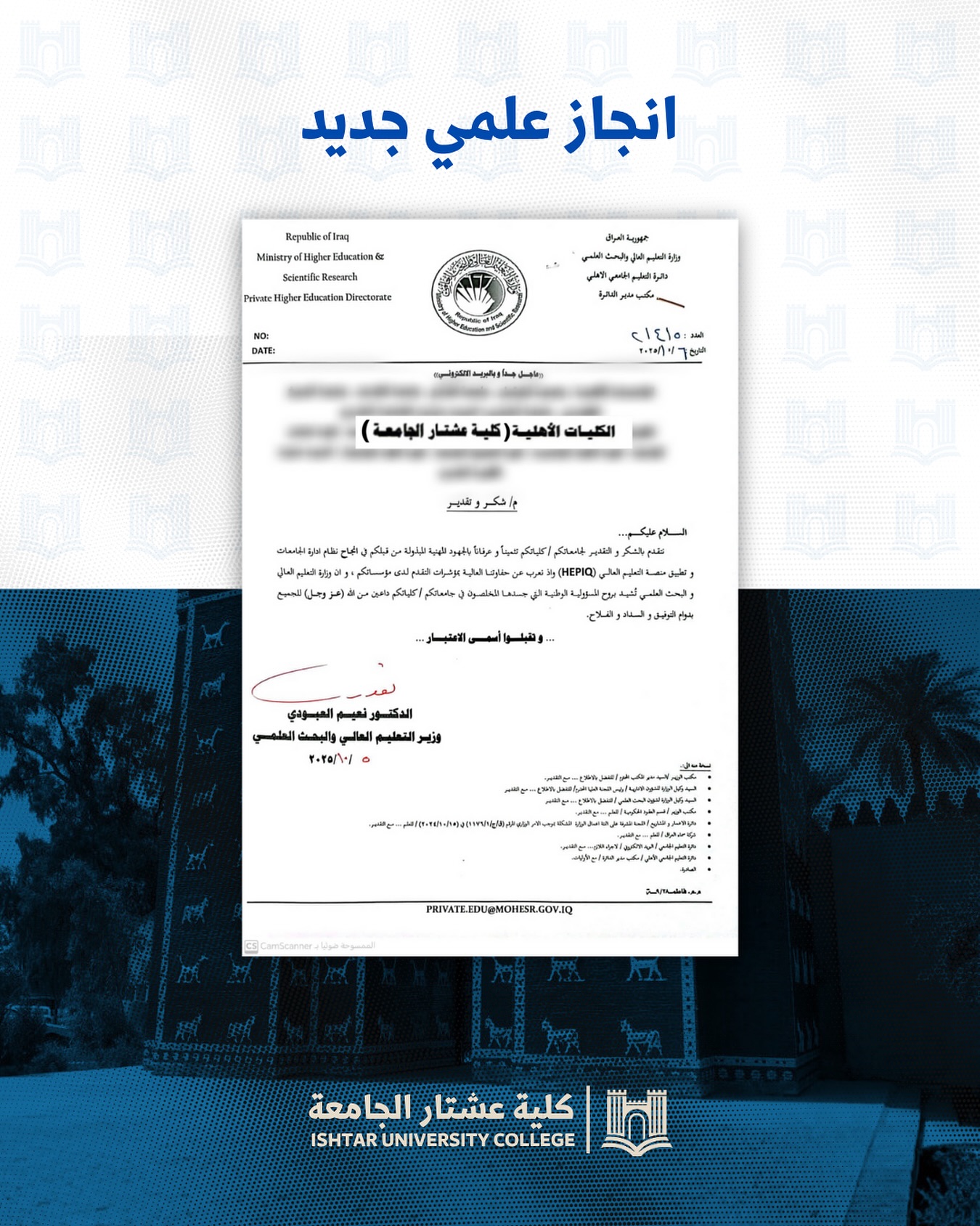 وزير التعليم العالي يوجّه كتاب شكر وتقدير إلى كلية عشتار الجامعة